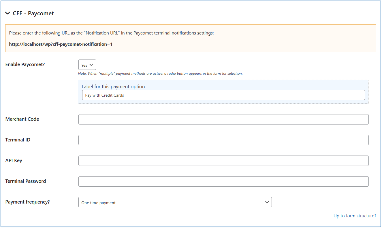 Enable the Paycomet payments, enter the "Merchant Code", "Terminal ID", "API Key", and the "Terminal Password".